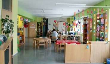 The design of the group rooms is similar – each group room has a changing area, different play areas as well as a separate sleeping room. The bathrooms are specially equipped for children and the disabled.